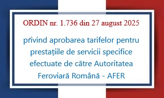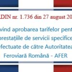 ORDIN nr. 1.736 din 27 august 2025 privind aprobarea tarifelor pentru prestațiile de servicii specifice efectuate de către Autoritatea Feroviară Română – AFER Articolul 1 Se aprobă tarifele pentru prestațiile de servicii specifice efectuate de către Autoritatea Feroviară Română – AFER, prevăzute în anexa care face parte integrantă din prezentul ordin. Articolul 2 Autoritatea Feroviară…
