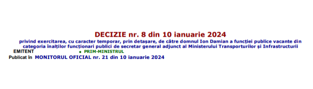 Începând cu data de 28 ianuarie 2024, domnul Ion Damian, director general al Direcției generale de control din cadrul Corpului de control al prim-ministrului, exercită, cu caracter temporar, prin detașare, funcția publică vacantă din categoria înalților funcționari publici de secretar general adjunct al Ministerului Transporturilor și Infrastructurii pentru o perioadă de 6 luni.